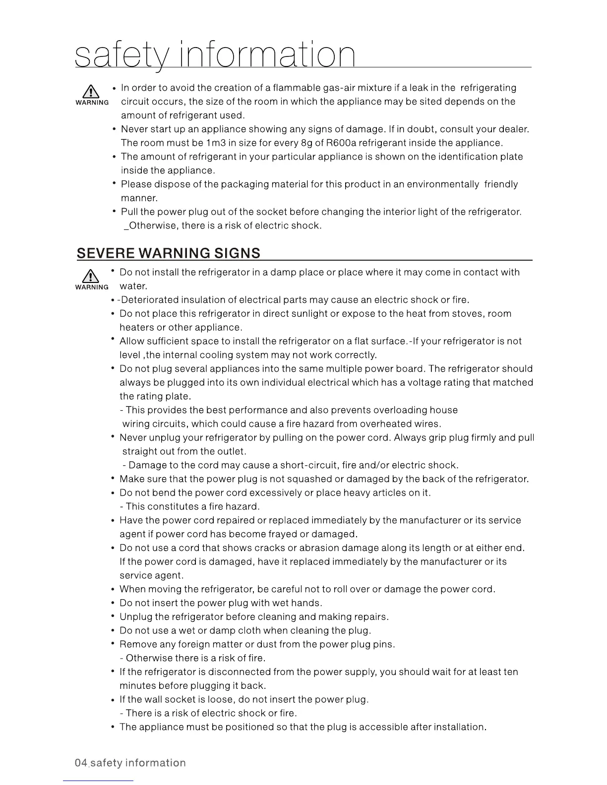 Samsung RL34ECSW - Severe Warning Signs and Precautions; Installation Environment and Electrical Safety