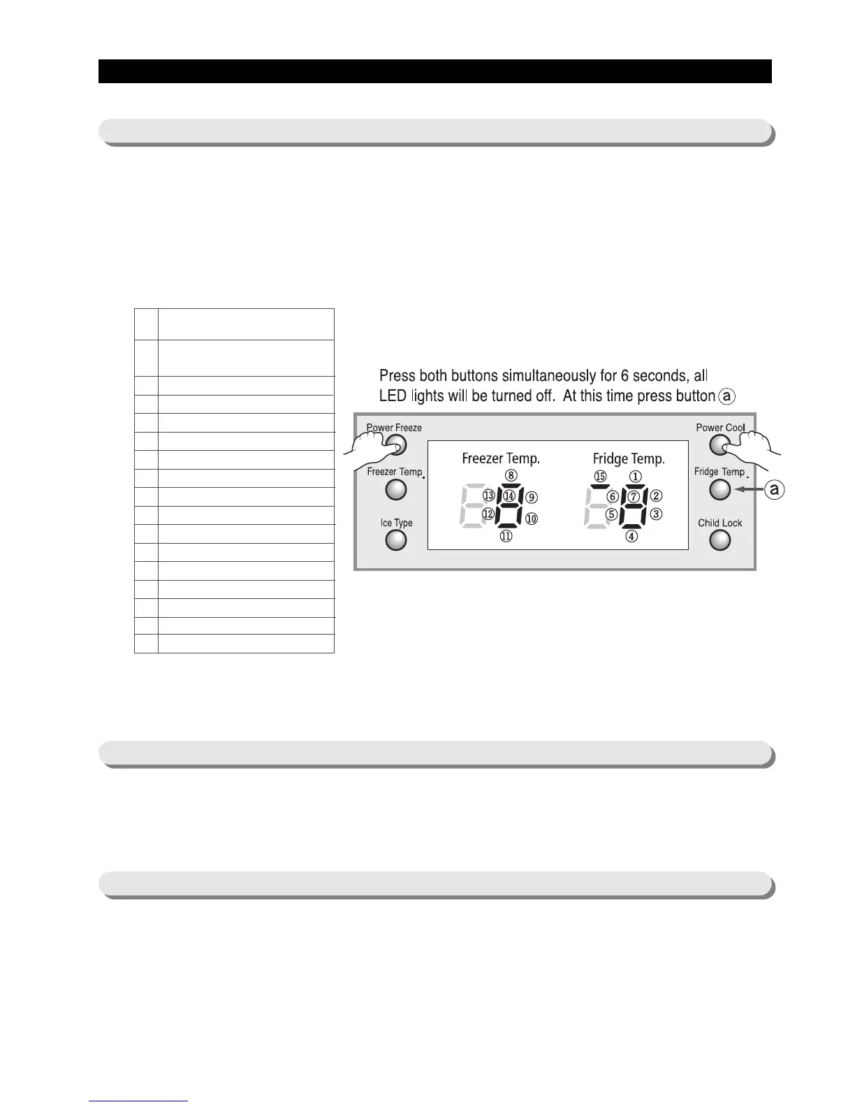 ● Press Freezer Temp. and Power Cool buttons simultaneously for 12 seconds to get into this mode.