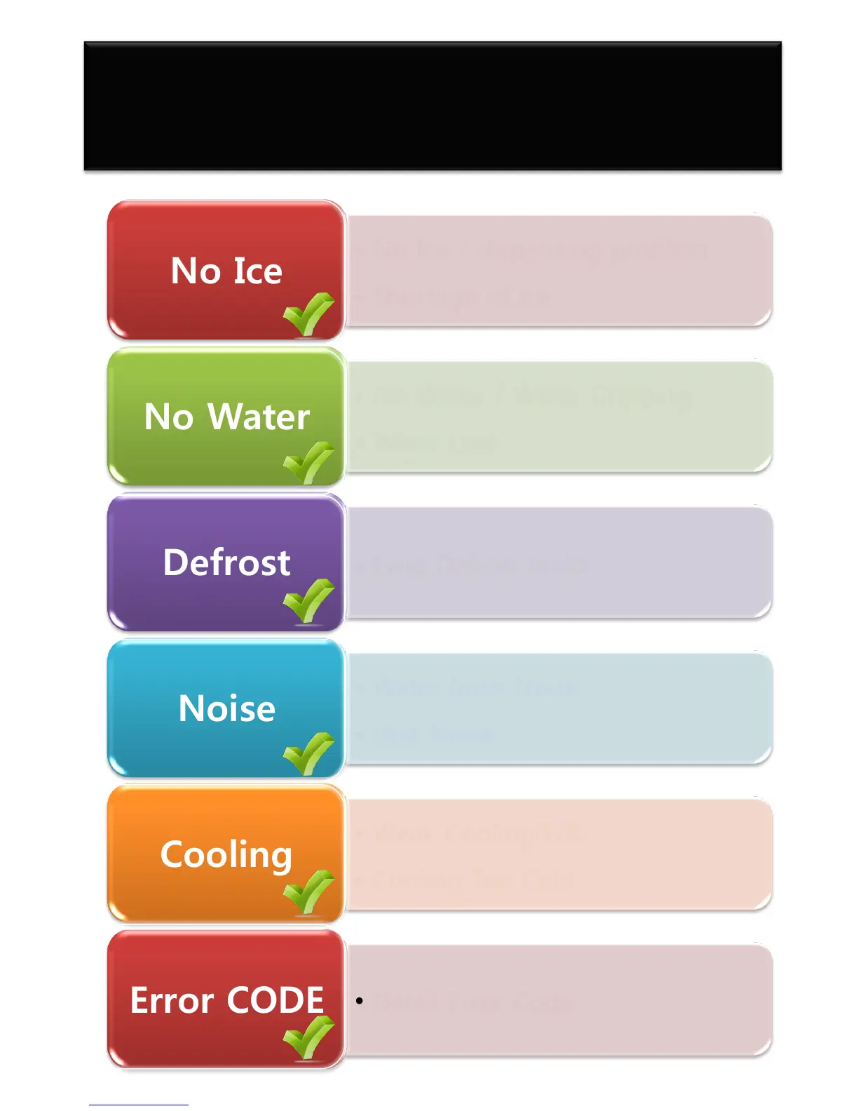 Samsung RS261M - No Ice Troubleshooting; No Water and Leak Troubleshooting; Defrost System Troubleshooting; Cooling Performance Troubleshooting