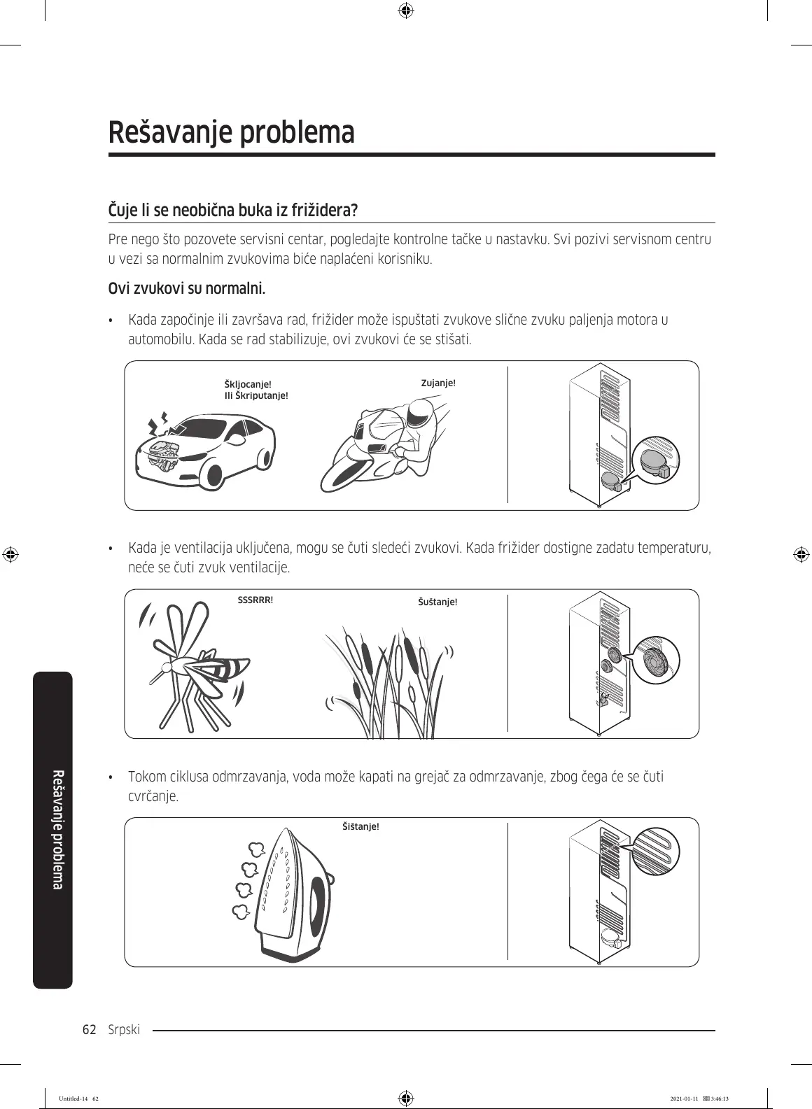 • Kada započinje ili završava rad, frižider može ispuštati zvukove slične zvuku paljenja motora u