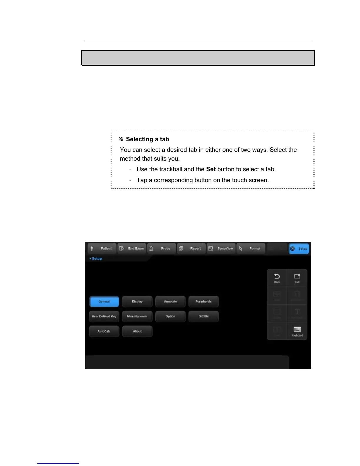 - Use the trackball and the Set button to select a tab.