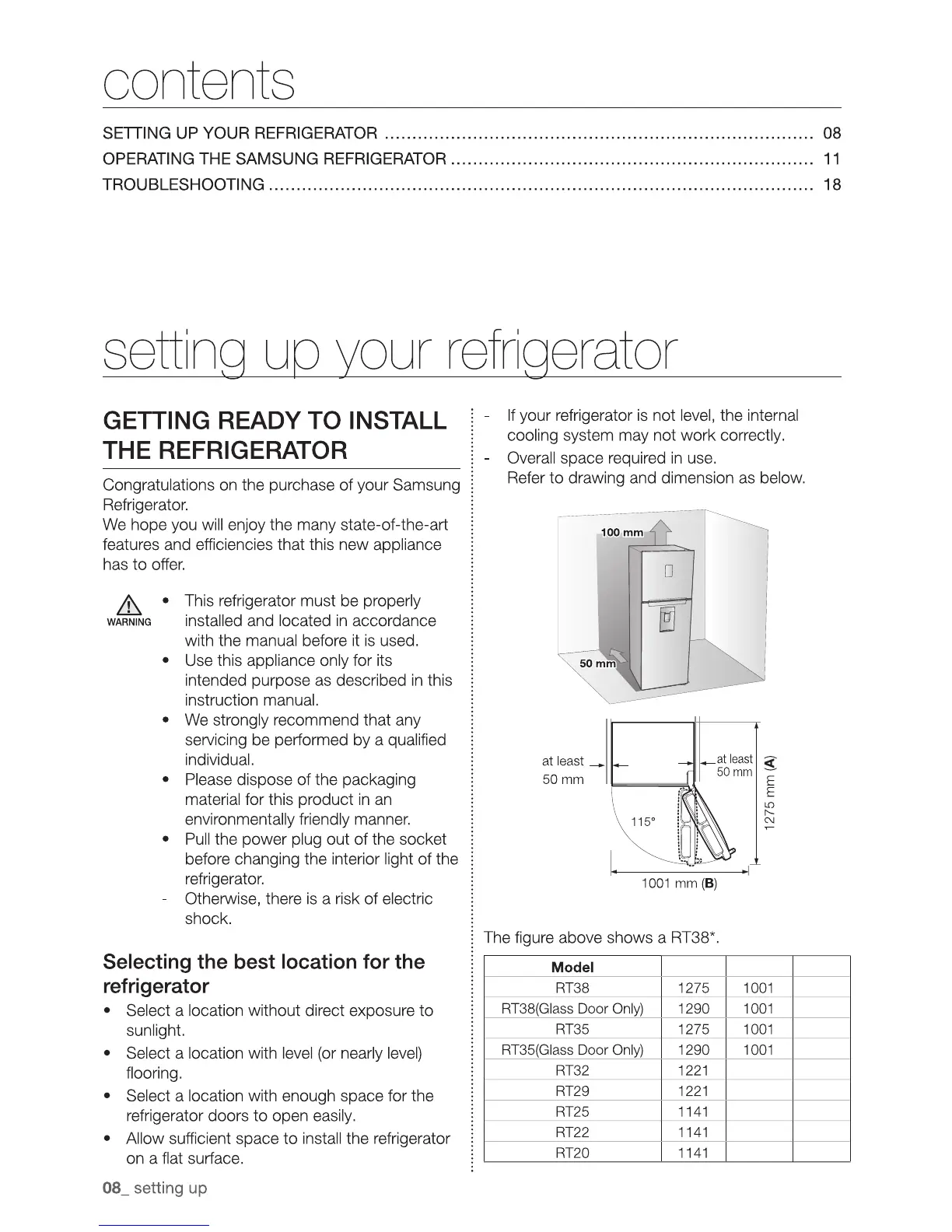 Samsung RT25 - Setting Up Your Refrigerator; Installation Preparation and Location