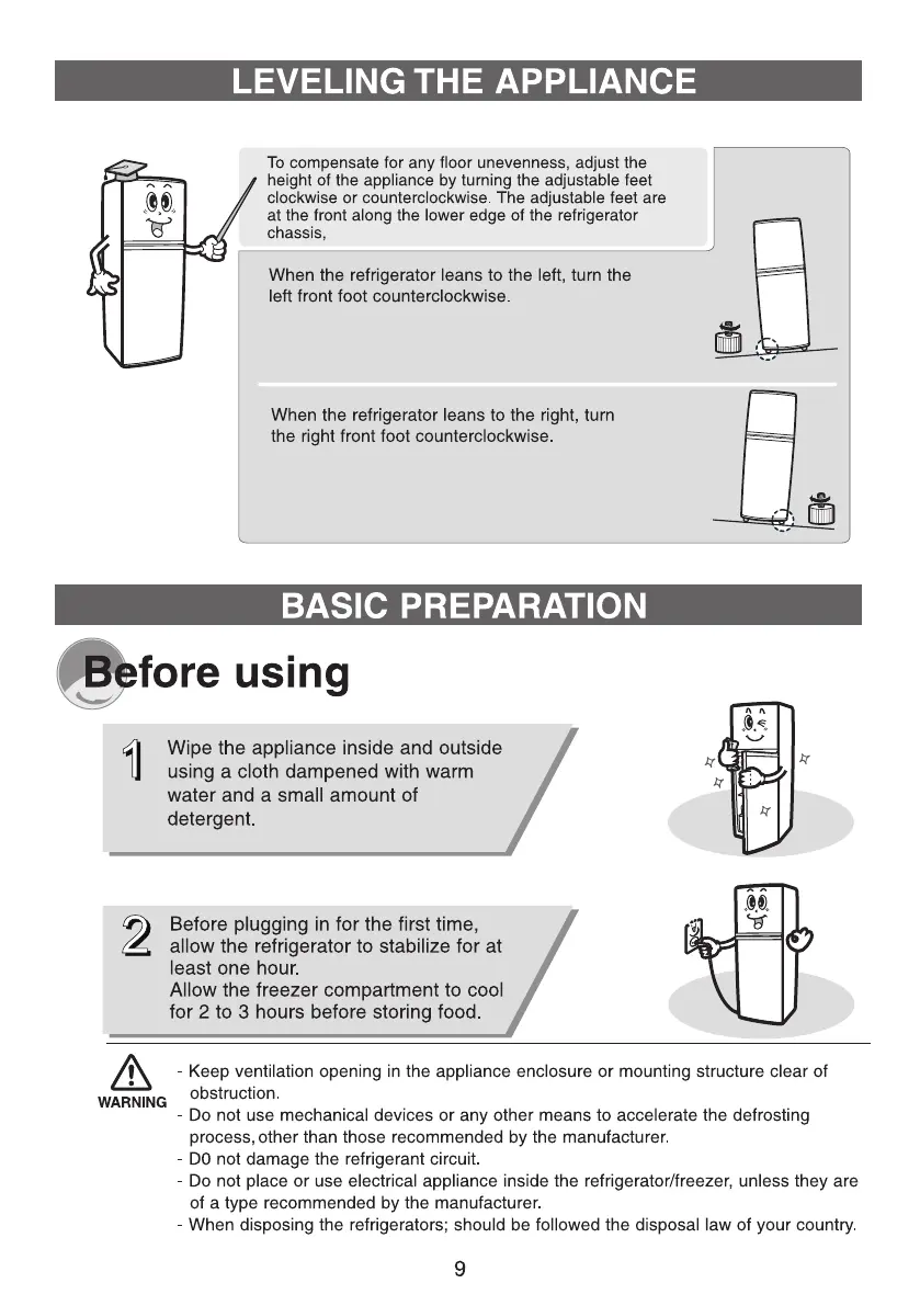 Samsung RT30G - Leveling the Appliance; Adjusting Feet; Basic Preparation; Cleaning Before Use