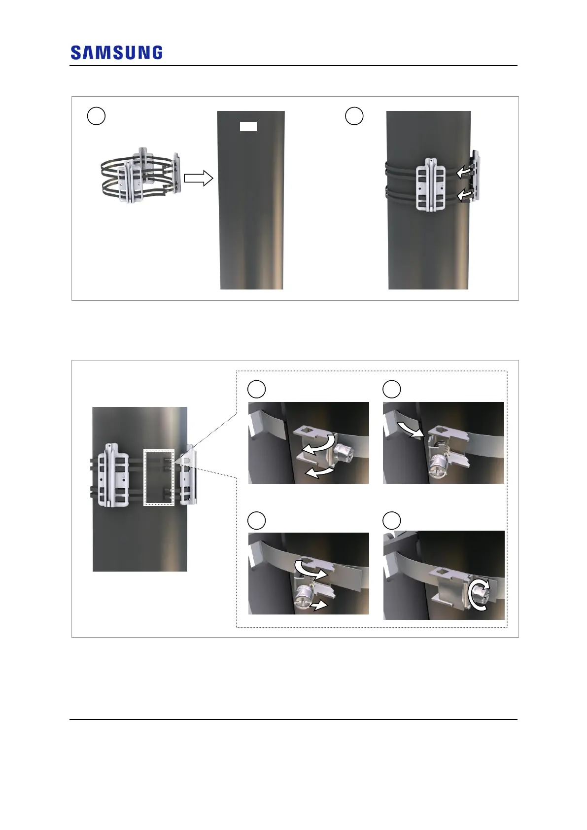 3 Fix the mounting brackets to the pole using the steel band.