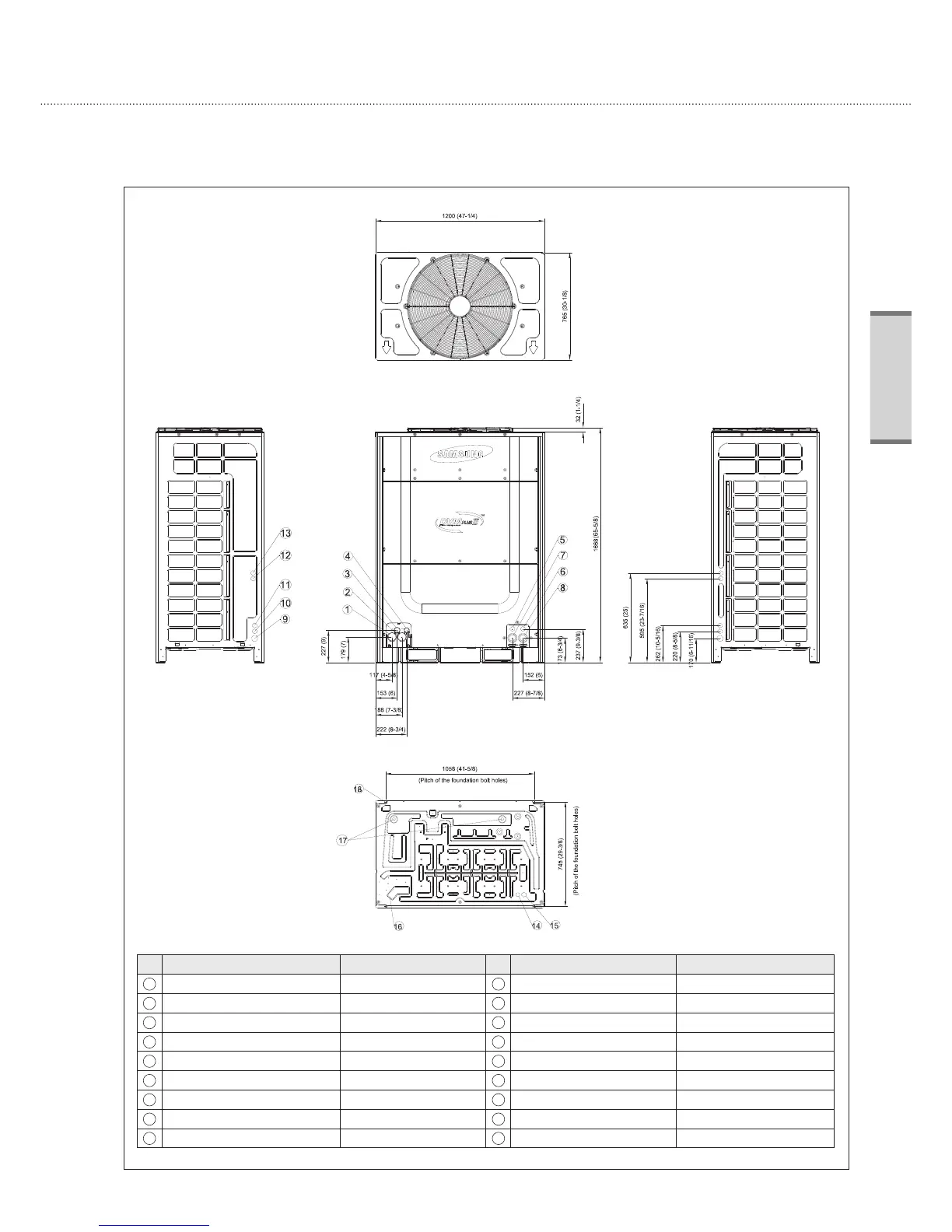 8 Power & communication wiring conduit Ø43.70, knock-out hole hole-front 17 Condensate drain holes Ø20mm-2 holes