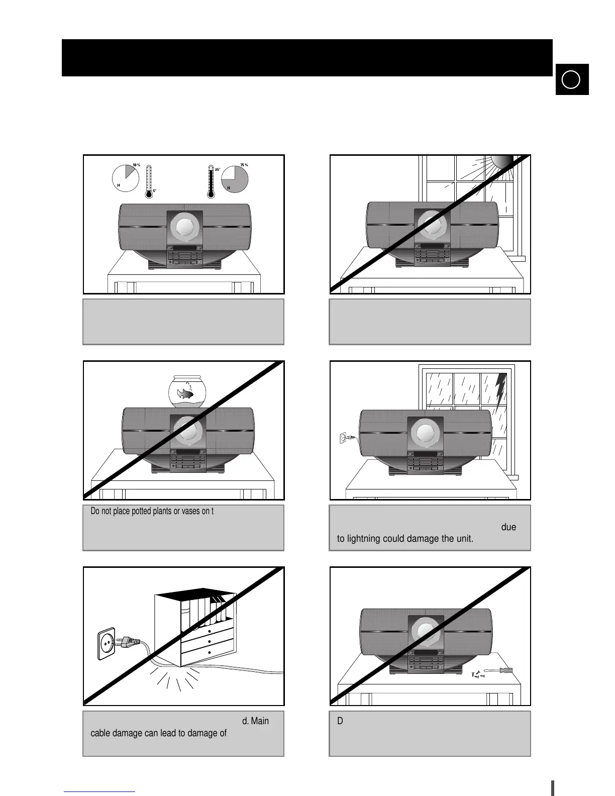 The following diagrams illustrate the precautions to be taken when using or moving your audio