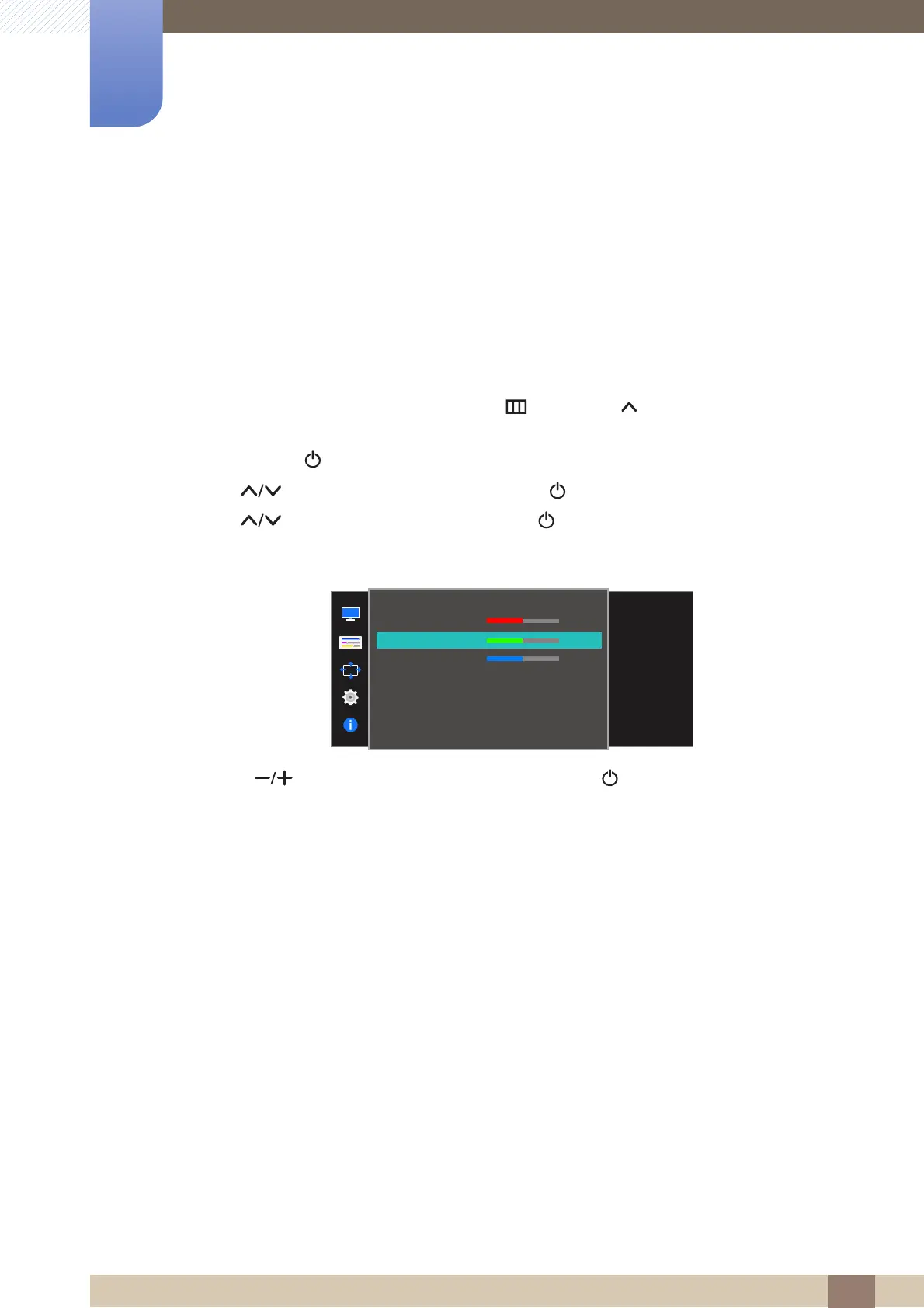 4 Use the [ ] buttons to adjust the Green, then press the [ ] button on the monitor.