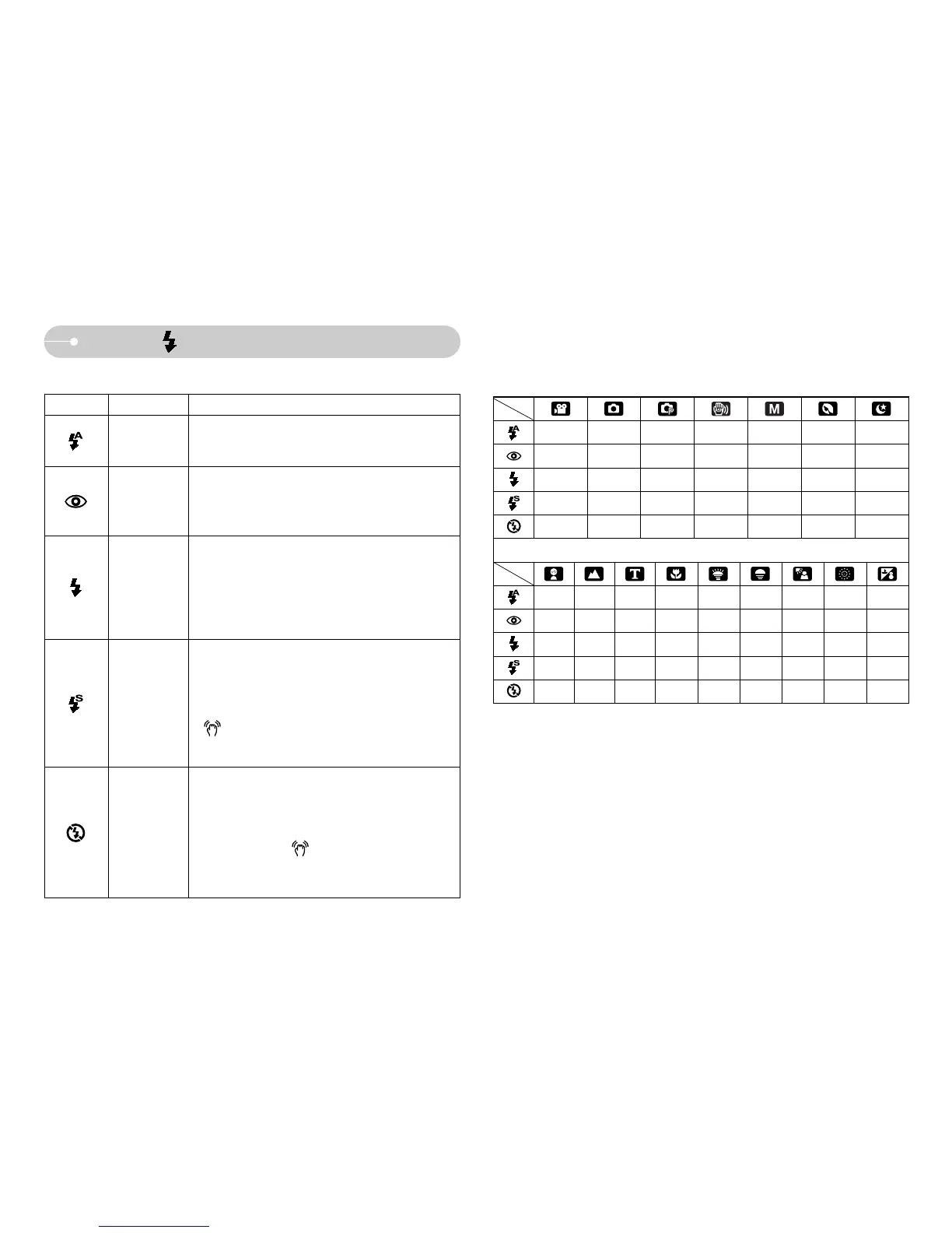 ● Available flash mode, by recording mode (O : Selectable X : Not selectable)