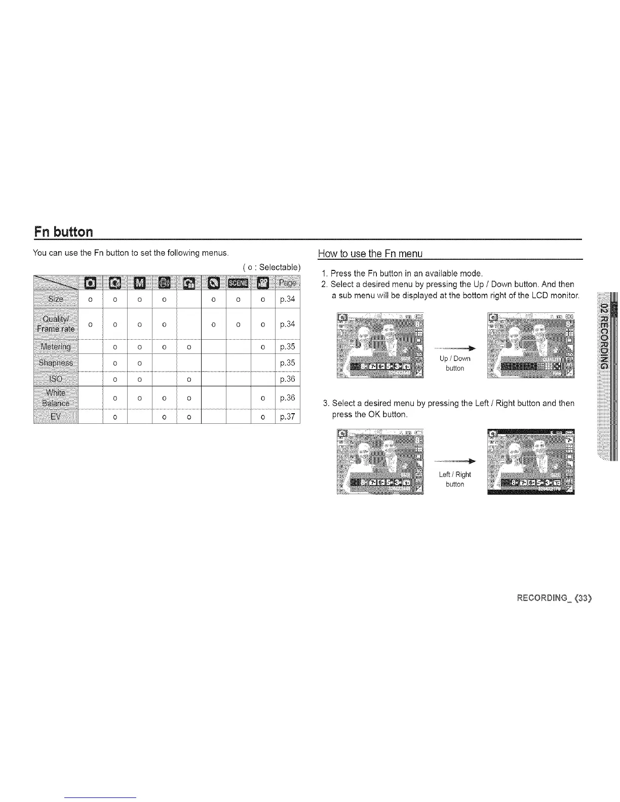 You can use the Fn button to set the following menus.