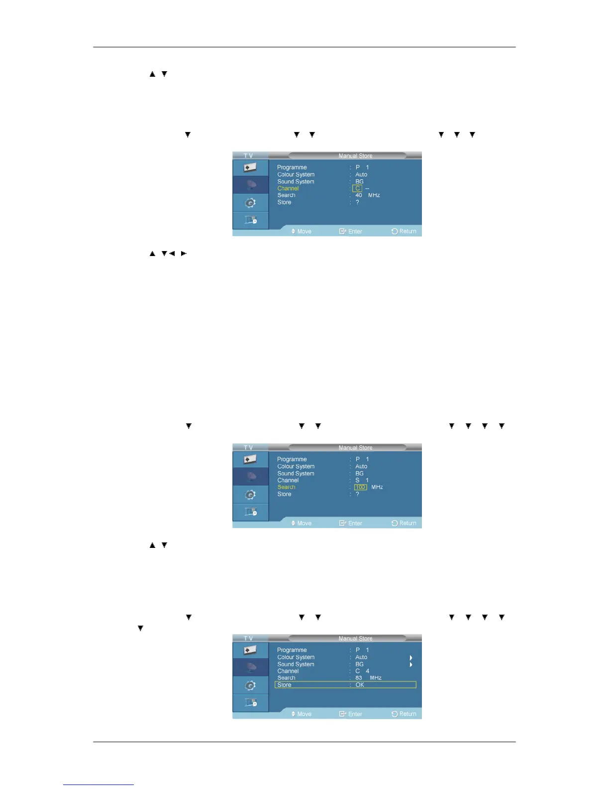 D.MENU → →[Channel] → ENTER → → → ENTER →[Manual Store] → → → →ENTER