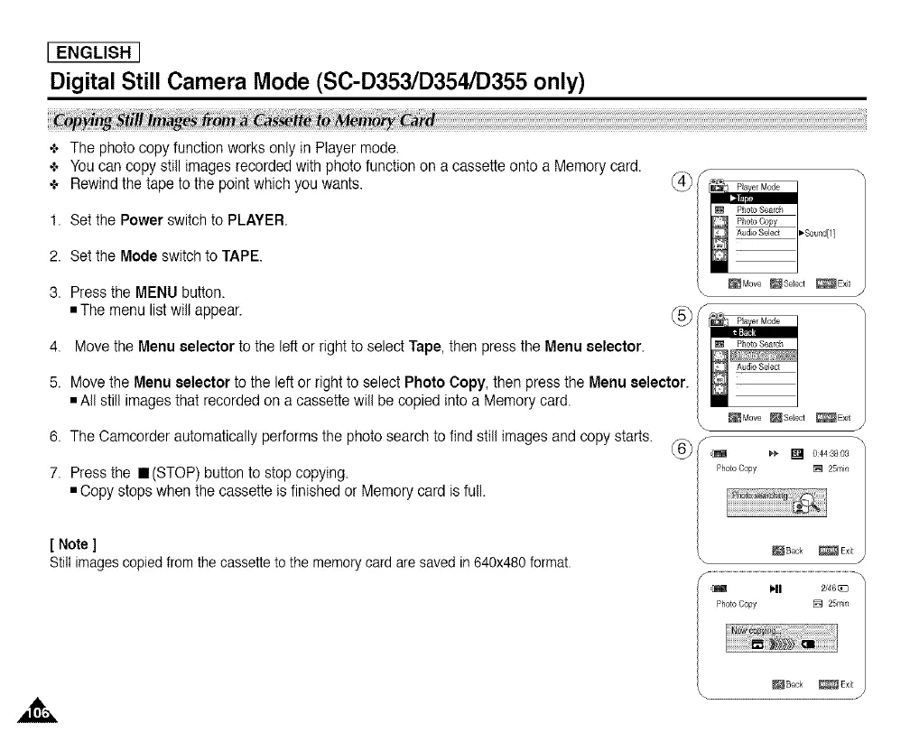 Youcan copy still images recorded with photo function on a cassette onto a Memory card.