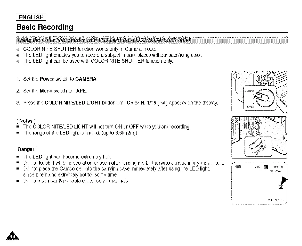 • The COLOR NITE/LED LIGHTwill notturn ON or OFF while you are recording.
