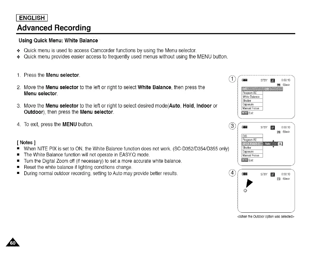 • When NITEPIXis set toON, theWhite Balancefunctiondoes notwork. (SC-D352/D354/D355only) _ E_'C:_ I "