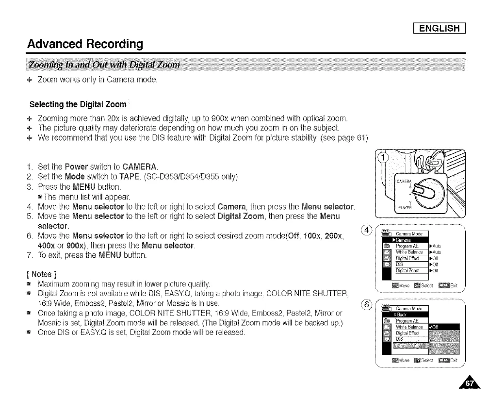 + We recommend that you use the DIS feature with Digital Zoom for picture stability.(see page 6t)