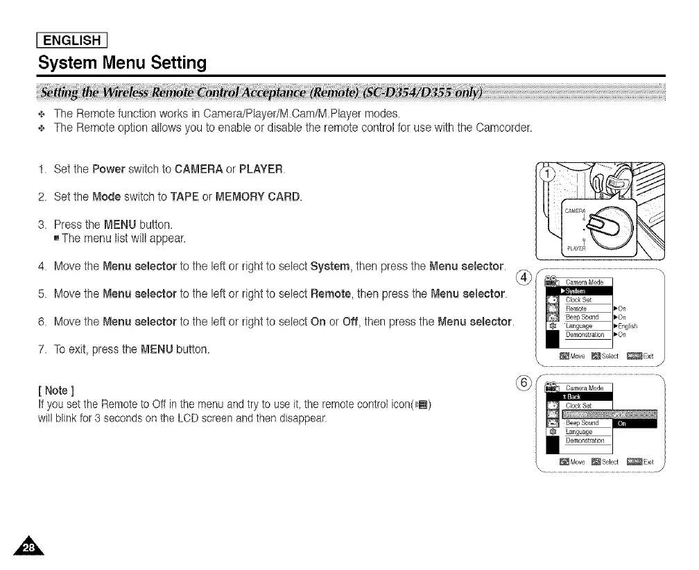 ¢ The Remotefunction works in Camera/Player/M.Cam/M.Hayer modes.