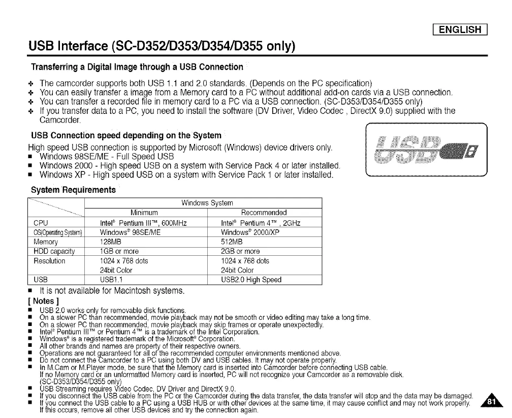 ÷ If you transfer data to a PC, you need to install the software (DV Driver,Video Oodec, DirectX 9.0) supplied with the