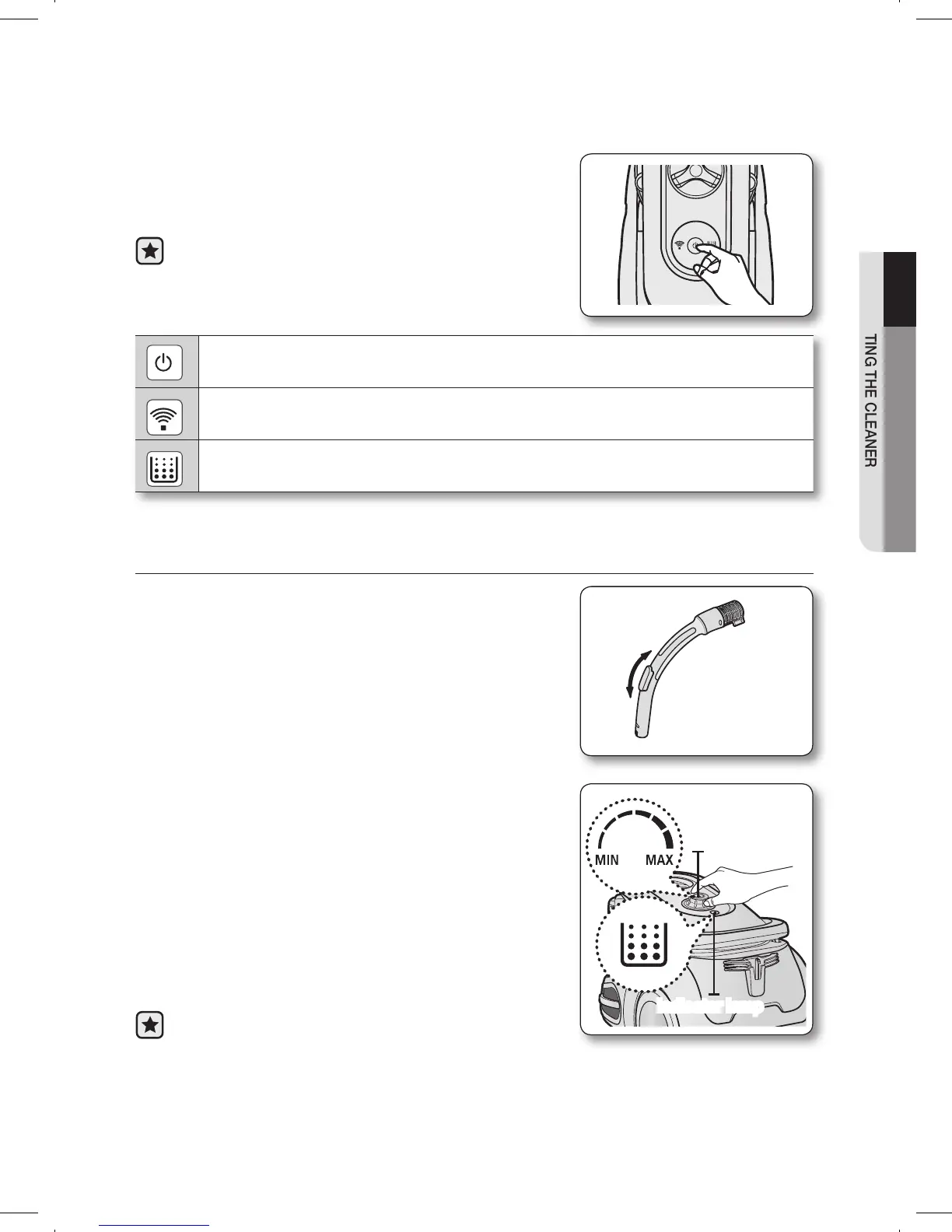 The ON/OFF button operates the vacuum cleanner or stops it.