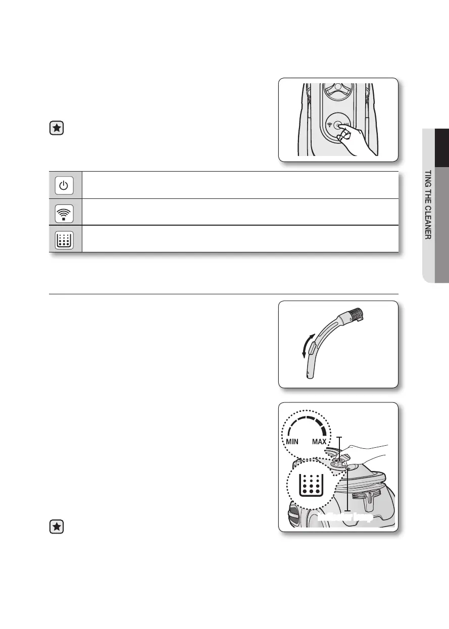 The ON/OFF button operates the vacuum cleanner or stops it.