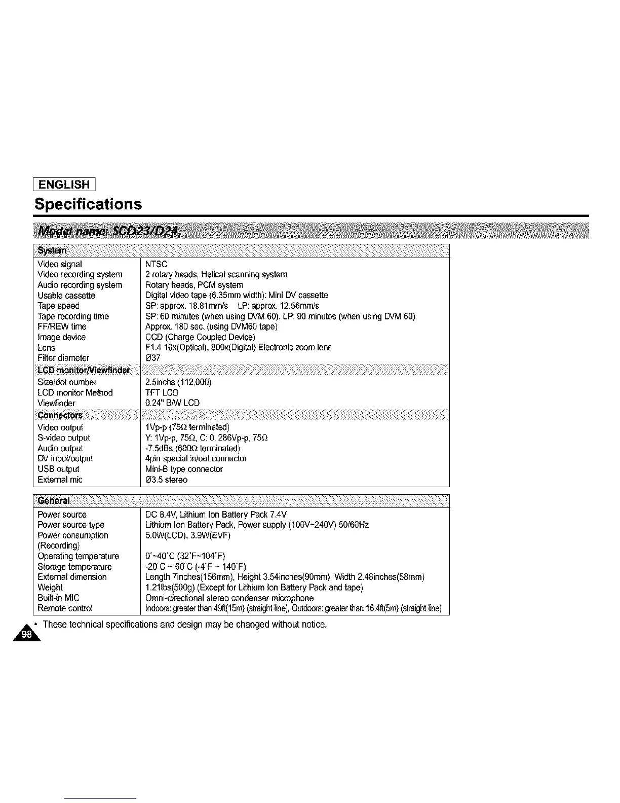 Taperecordingtime SP:60 minutes(whenusing DVM60), LP:90minutes(whenusingDVM60)