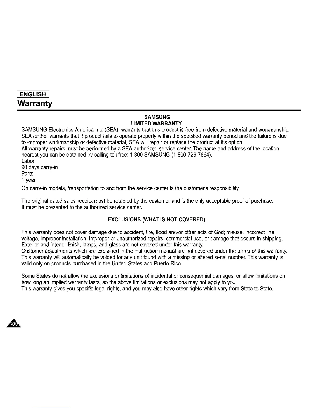 SAMSUNG Electronics America Inc. (SEA), warrants that this product is free from defective material and workmanship.
