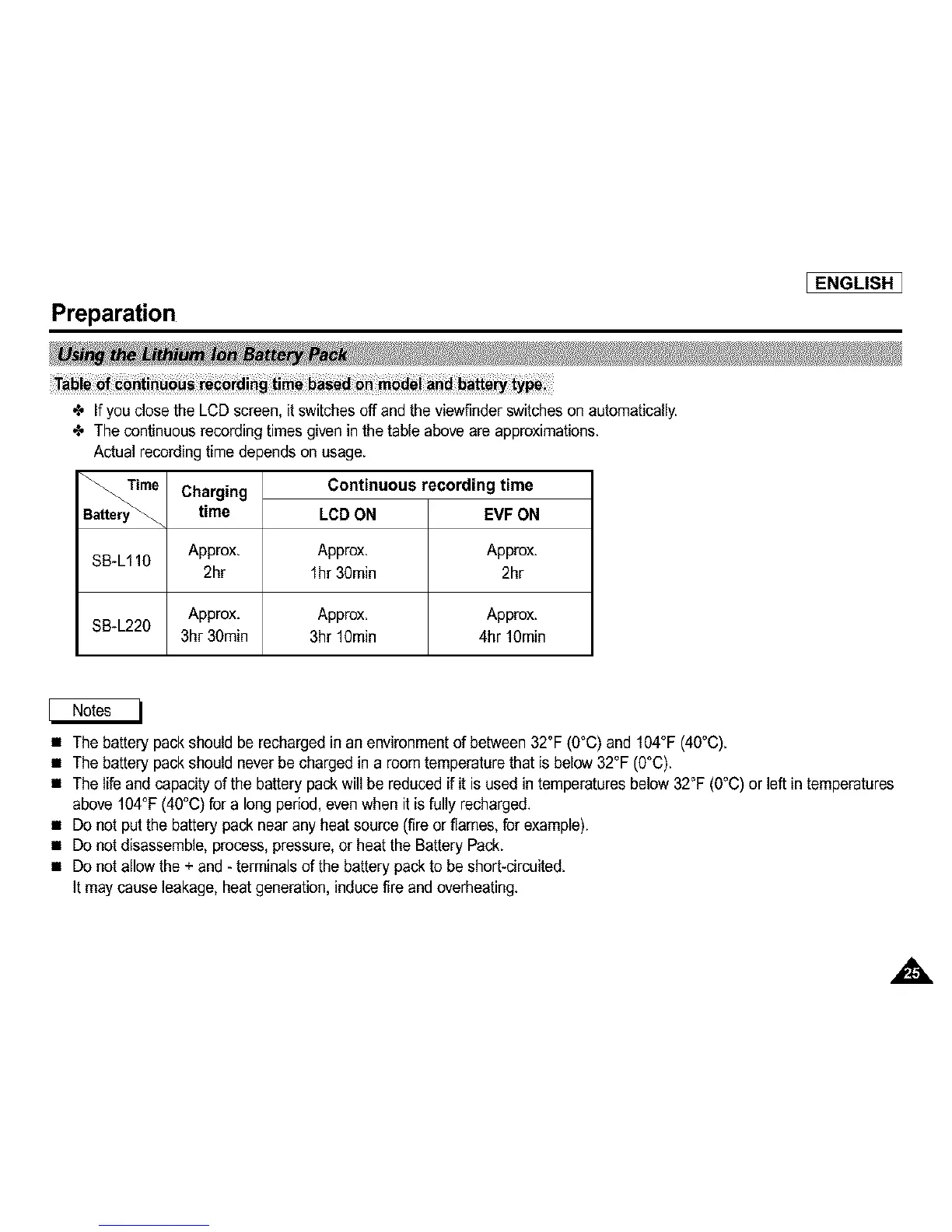 • The life and capacity of the battery packwill be reduced if it is used in temperatures below 32°F (O°C)or left intemperatures