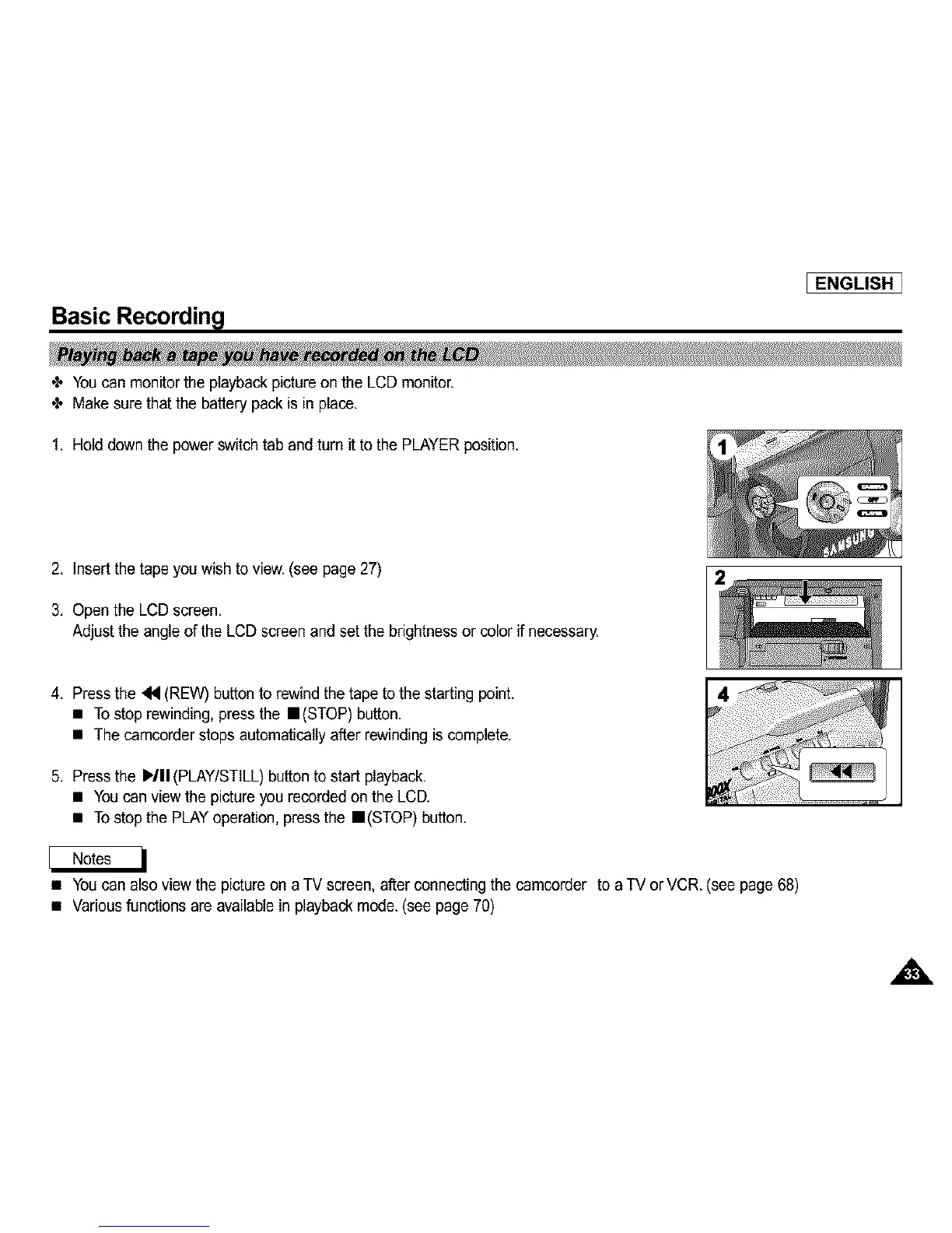 • You can also view the picture on aTV screen, after connectingthe camcorder to a TV or VCR. (see page 68)