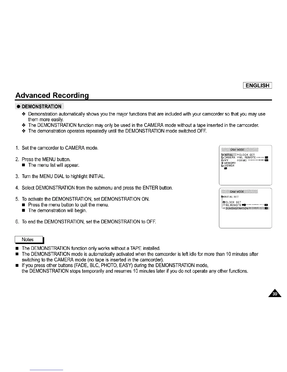 _, The DEMONSTRATIONfunction may only be used in the CAMERA mode without a tape insertedinthe camcorder.