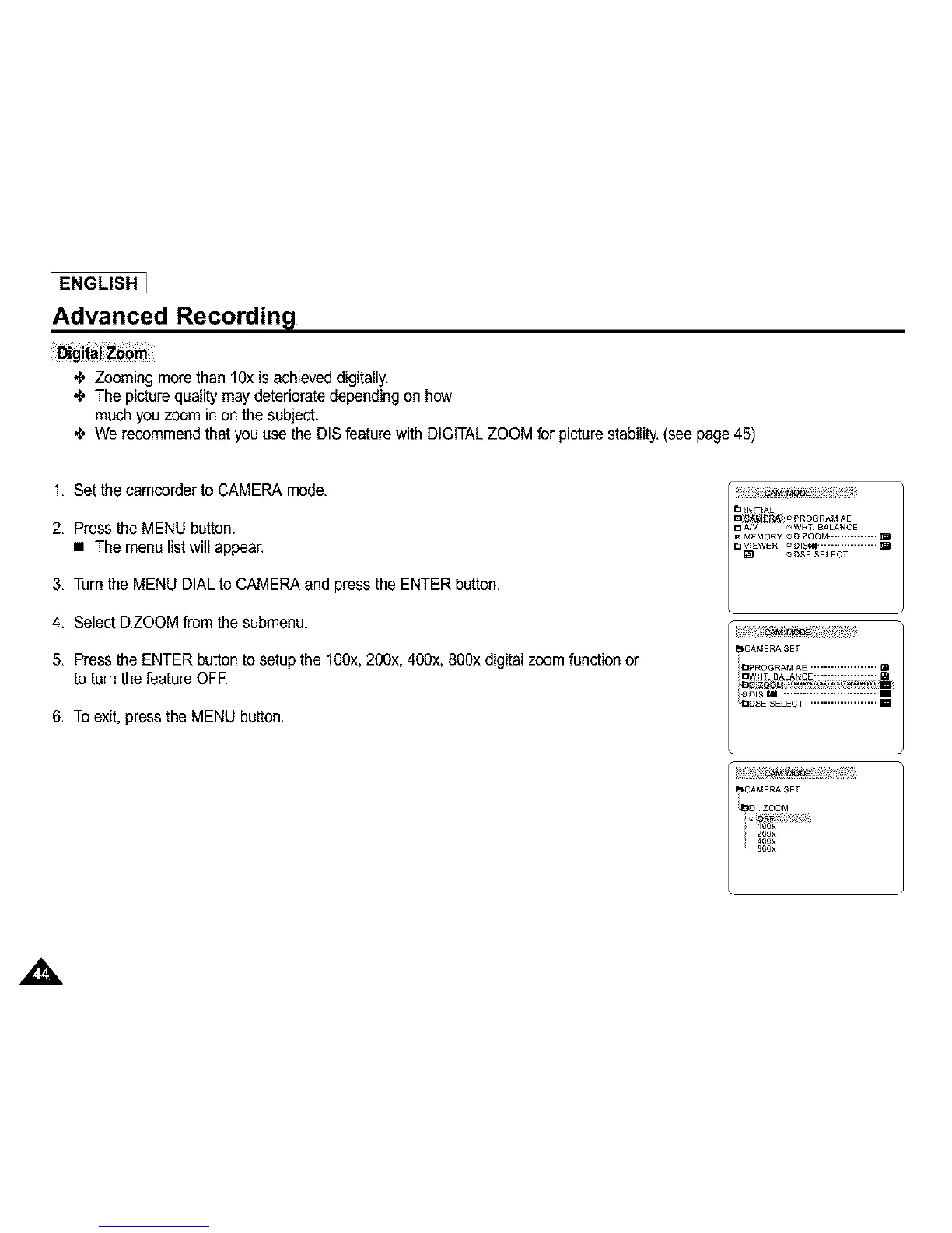•l, We recommend that you use the DIS feature with DIGITALZOOM for picturestability.(see page 45)
