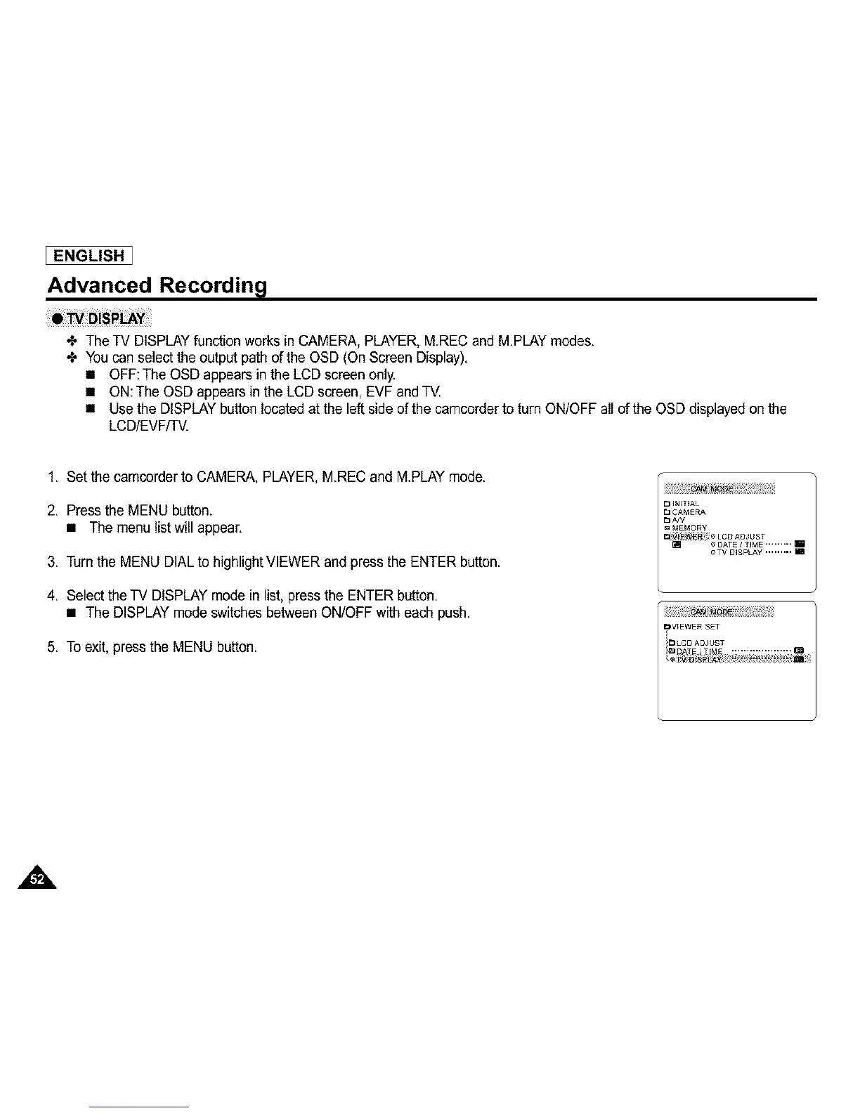 _, The TV DISPLAYfunction works in CAMERA, PLAYER,MREC and MPLAY modes.