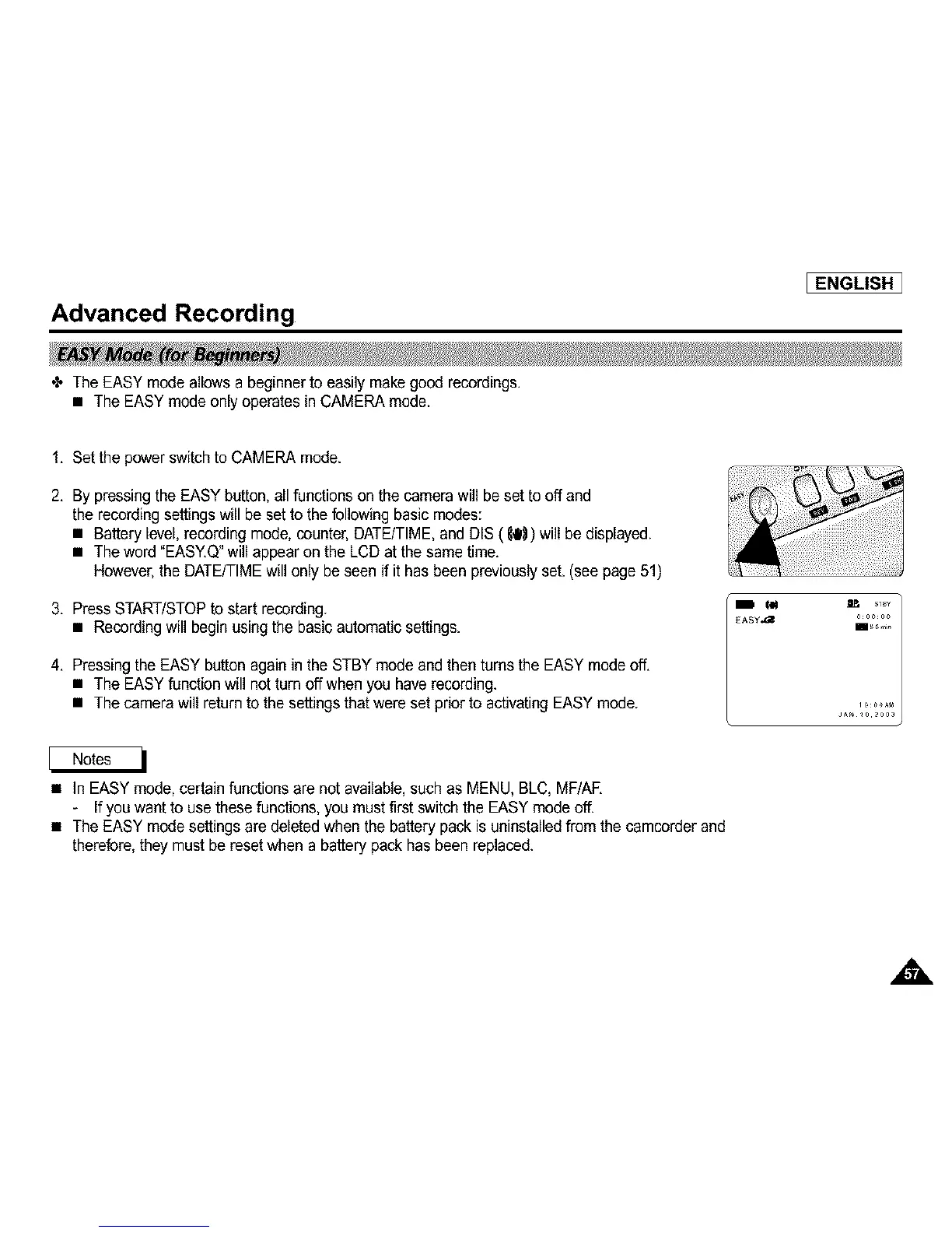 • The EASY mode settings are deleted when the battery pack is uninstalledfrom the camcorder and