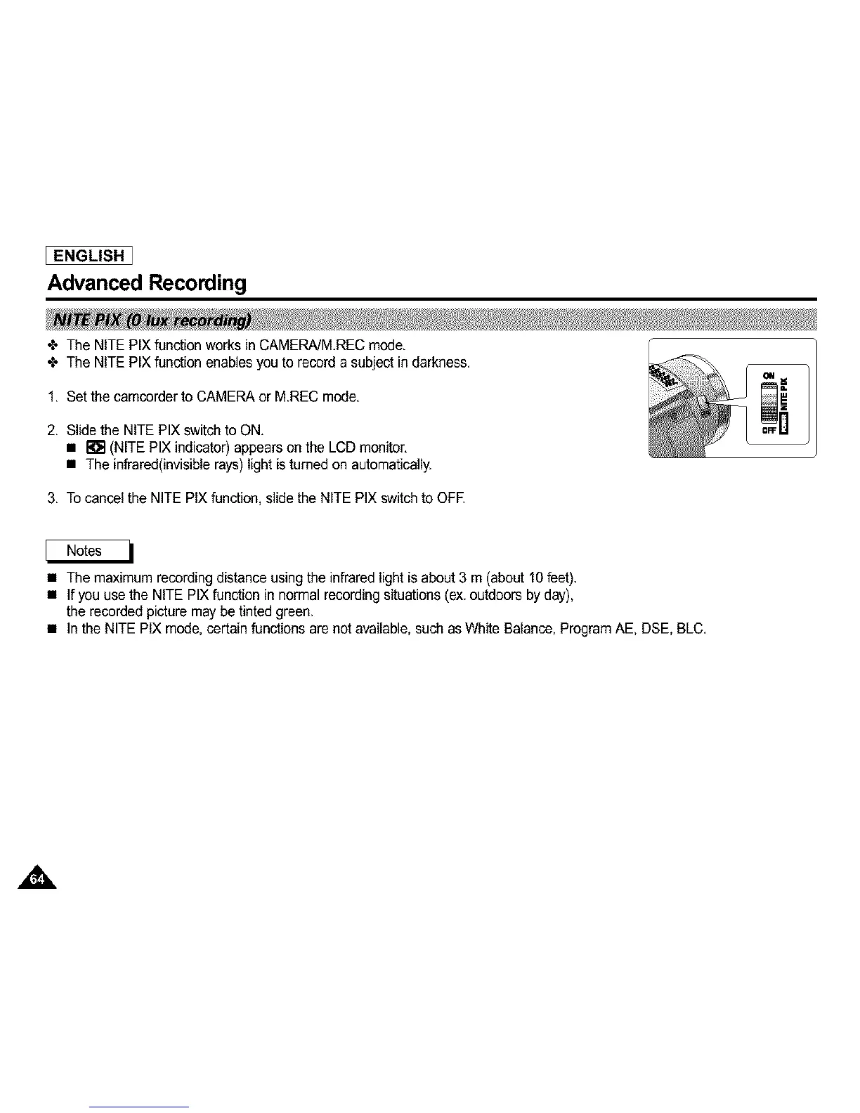 • In the NITE PIX mode, certain functions are not available,such as White Balance, Program AE, DSE, BLC.