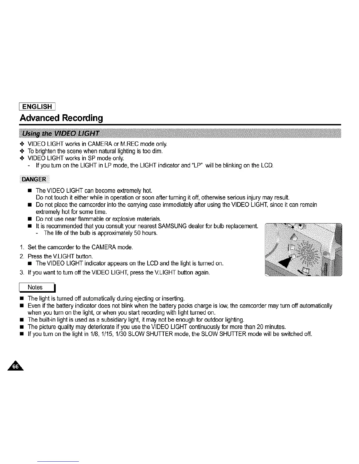 3. If youwant to turn off the VIDEO LIGHT,press the V.LIGHT button again.