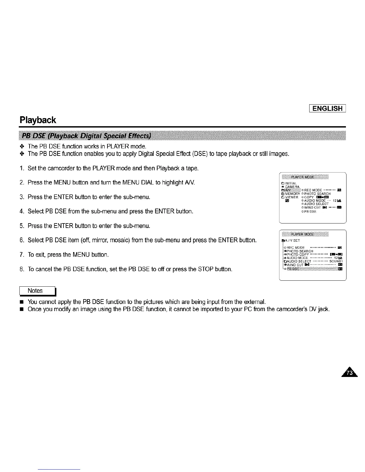 • Once you modify an image usingthe PB DSE function, it cannot be imported to your PC from the camcorder's DVjack.