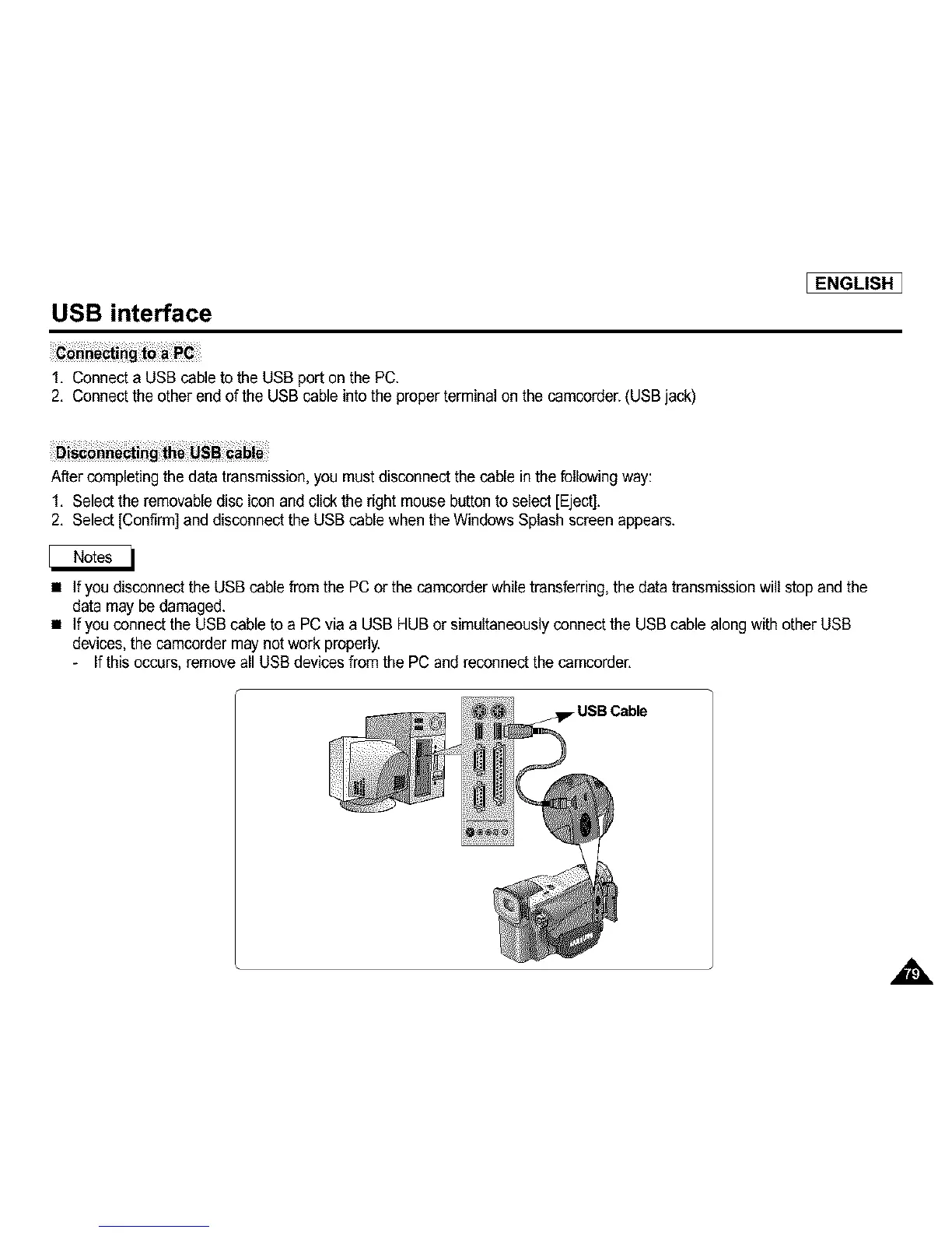 • If you disconnect the USB cable from the PC or the camcorder while transferring,the data transmissionwill stop and the