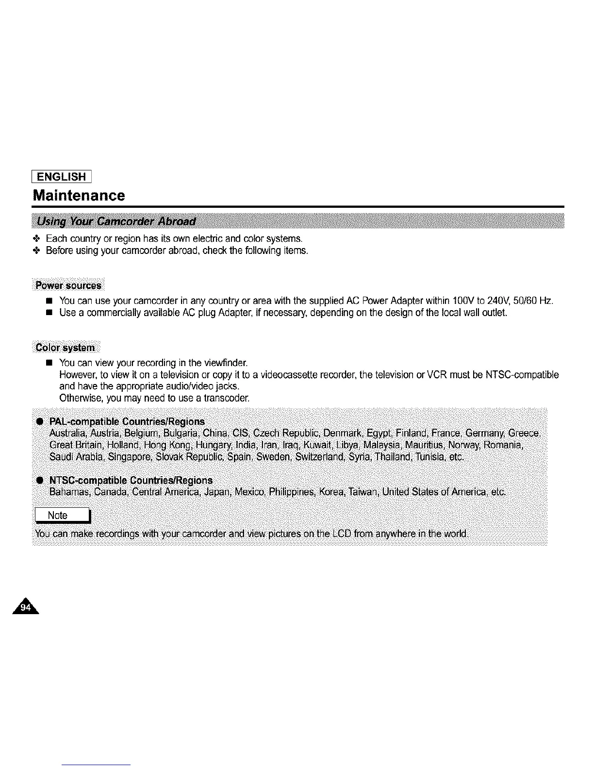 • Youcan use your camcorder in any country or area with the supplied AC Power Adapter within 100V to 240V,50/60 Hz.