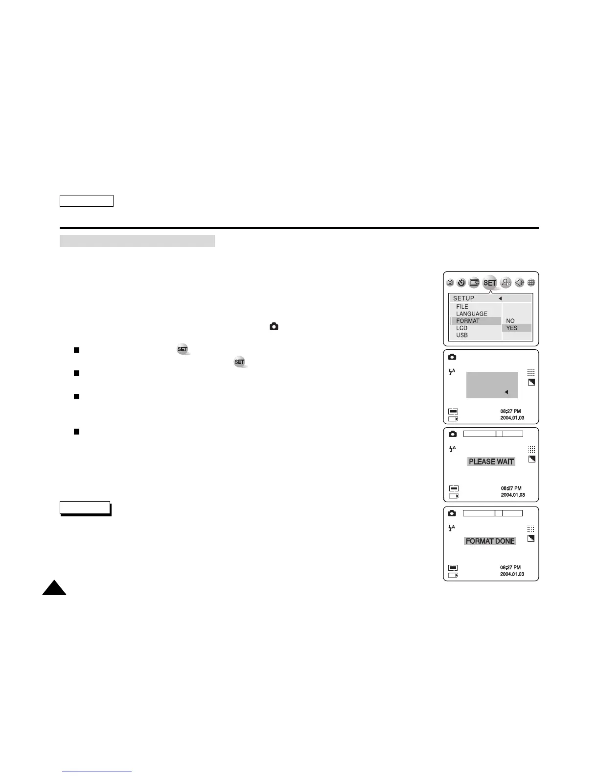 6. If "YES" is selected, message "FORMAT:OK" appears on the LCD monitor.