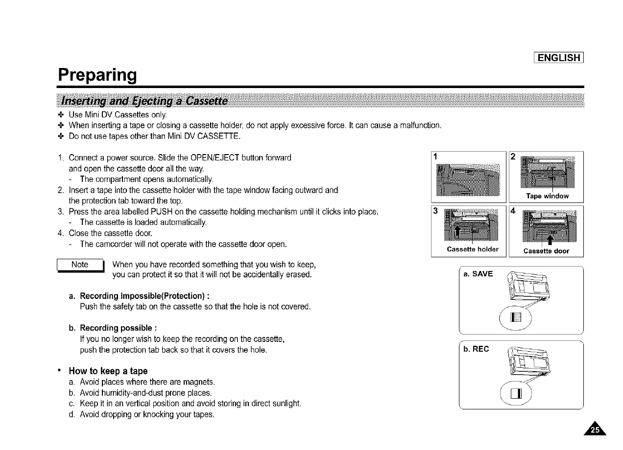 2. Insert a tape intothe cassette holder with the tape window facing outward and