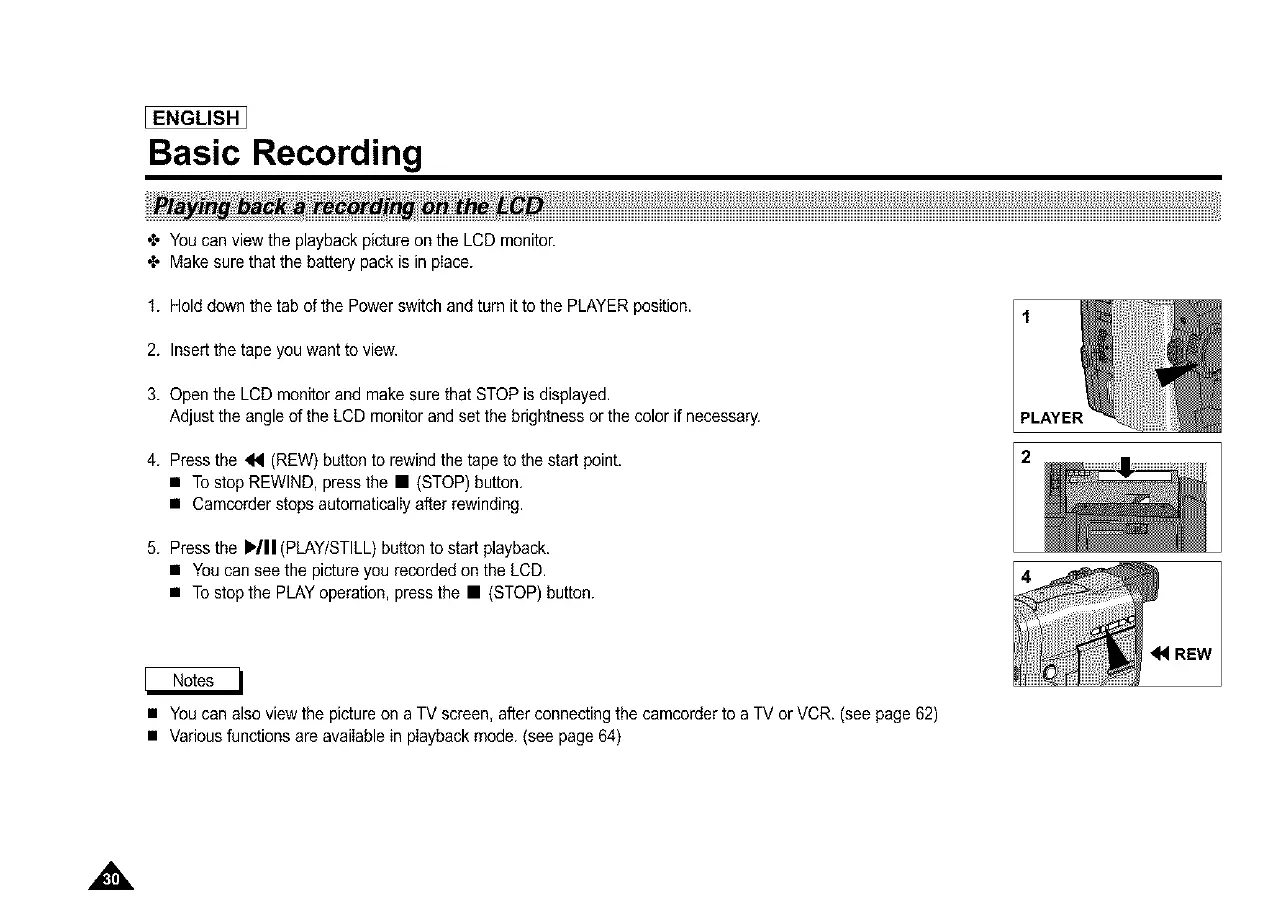 • You can also view the picture on a TV screen, after connectingthe camcorder to a TV or VCR. (see page 62)