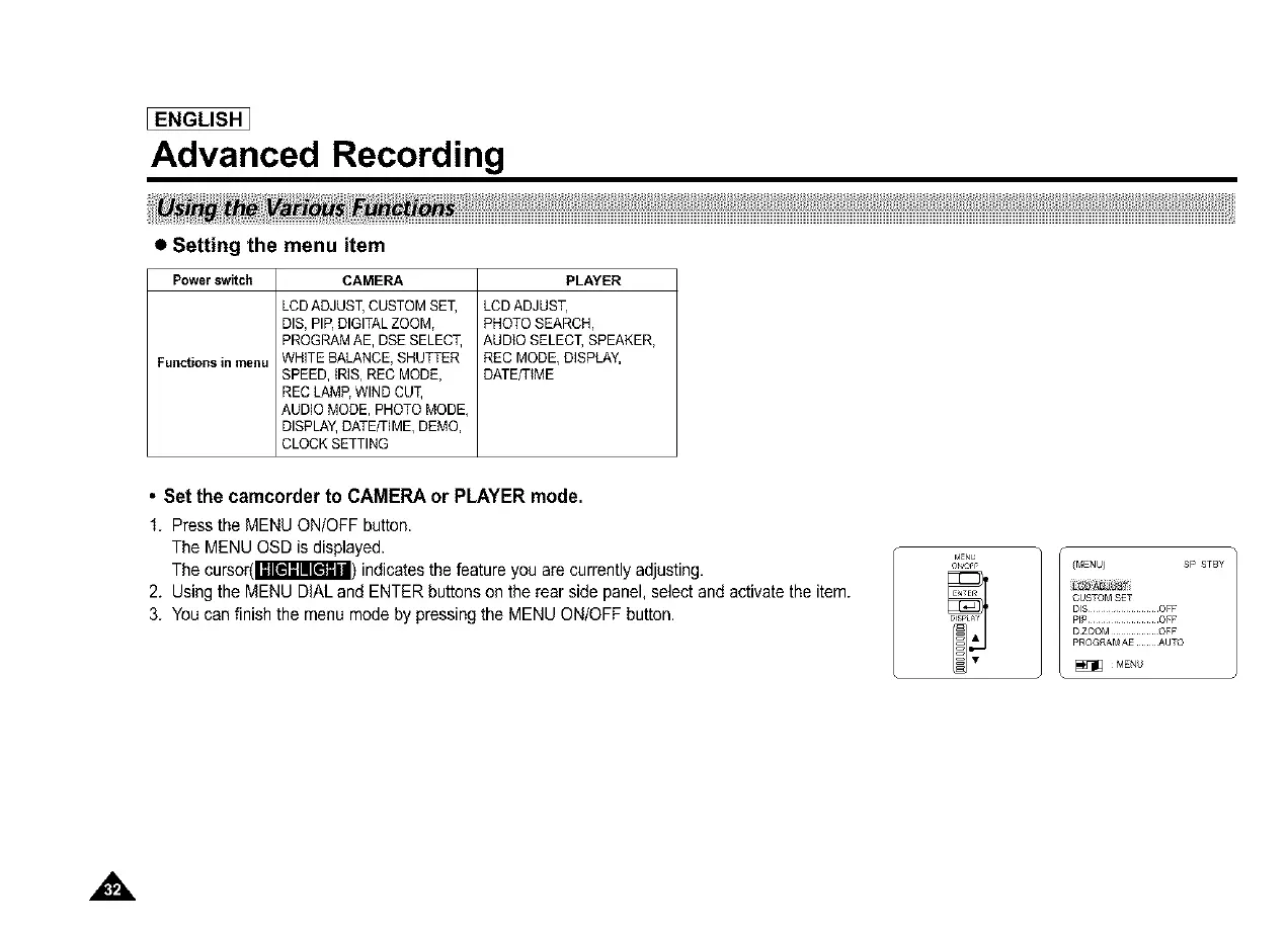 • Setthe camcorderto CAMERA or PLAYER mode.