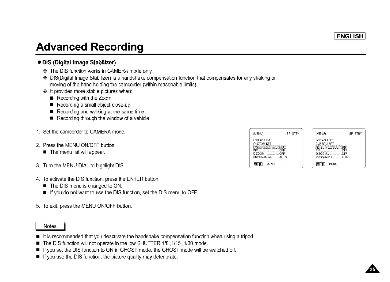 • If you use the DIS function, the picture quality may deteriorate.