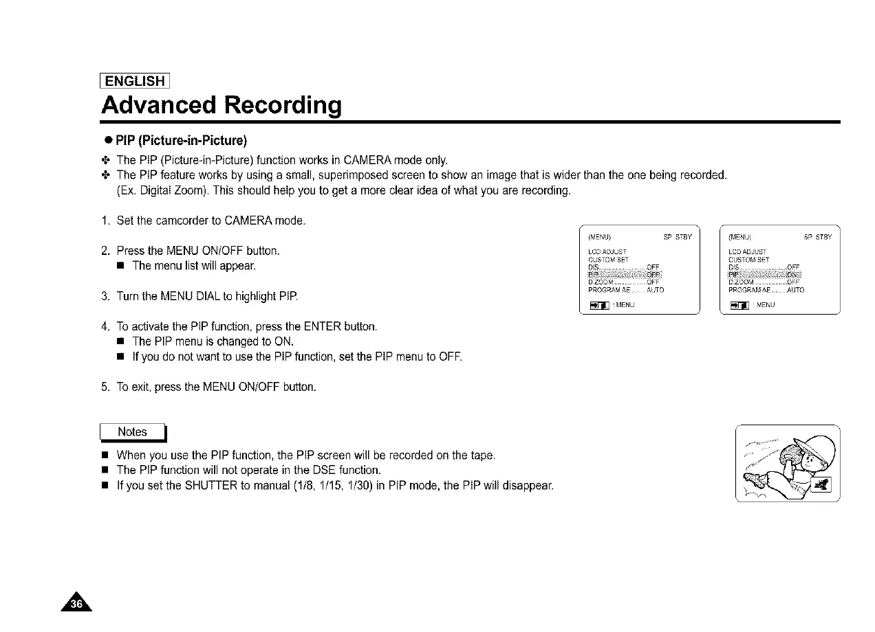 • If you set the SHUTTER to manual (1/8, 1/15, 1/30) in PIP mode, the PIP will disappear.