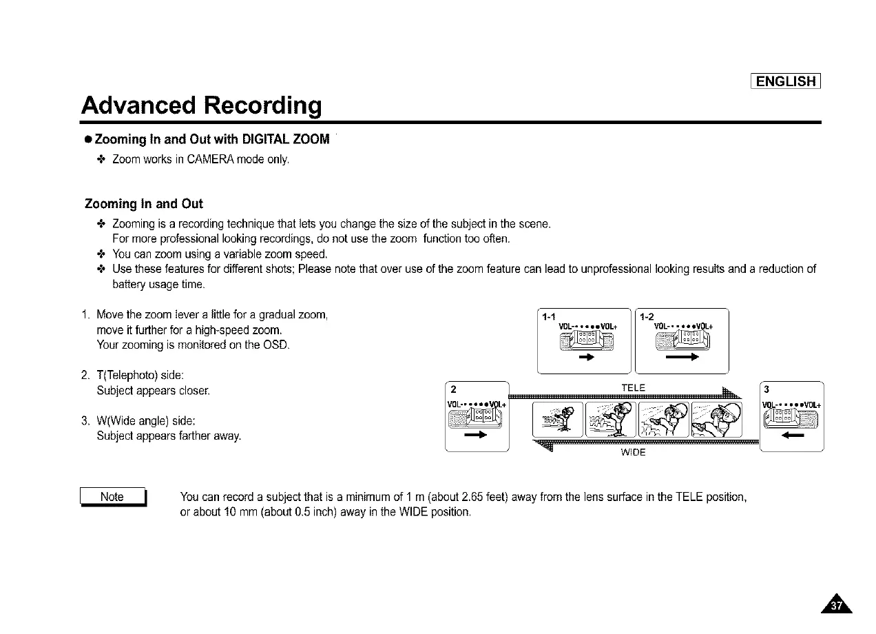 Youcan record a subject that is a minimum of 1 m (about 2.65 feet) away from the lens surface in the TELE position,