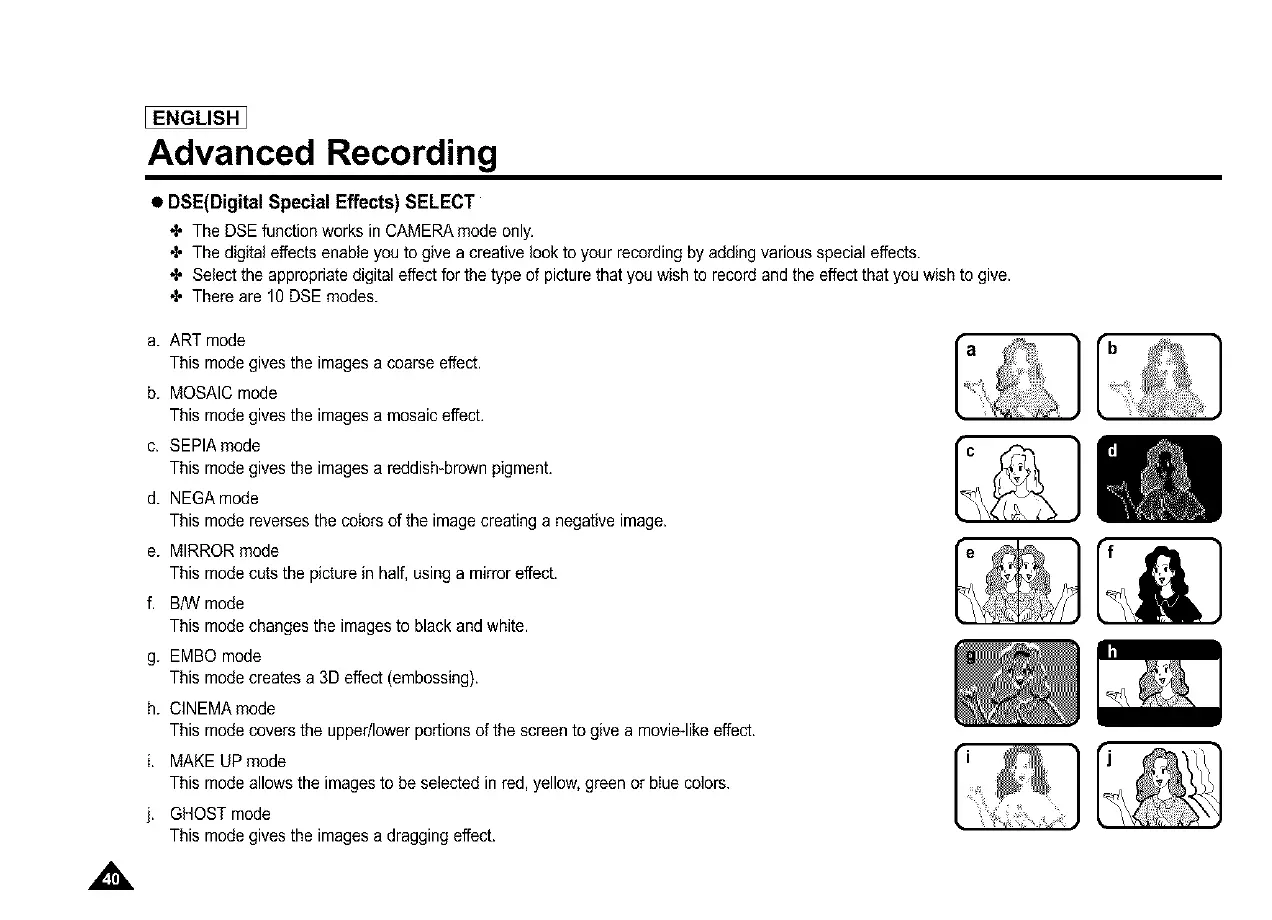 + Select the appropriate digital effect for the type of picture that you wish to record and the effect that you wish to give.