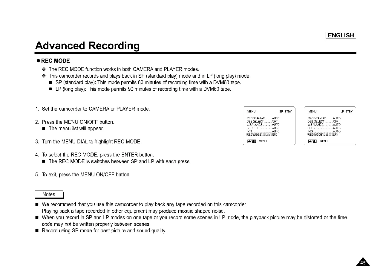 + This camcorder records and plays back in SP (standard play) mode and in LP (long play) mode.