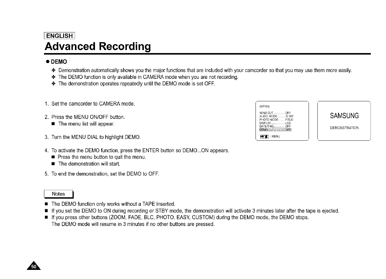 • If you set the DEMO to ON during recording or STBY mode, the demonstration will activate 3 minutes later after the tape is ejected.