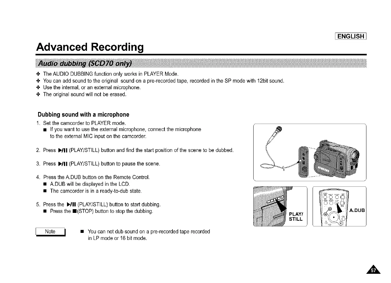 The AUDIO DUBBING function only works in PLAYER Mode.