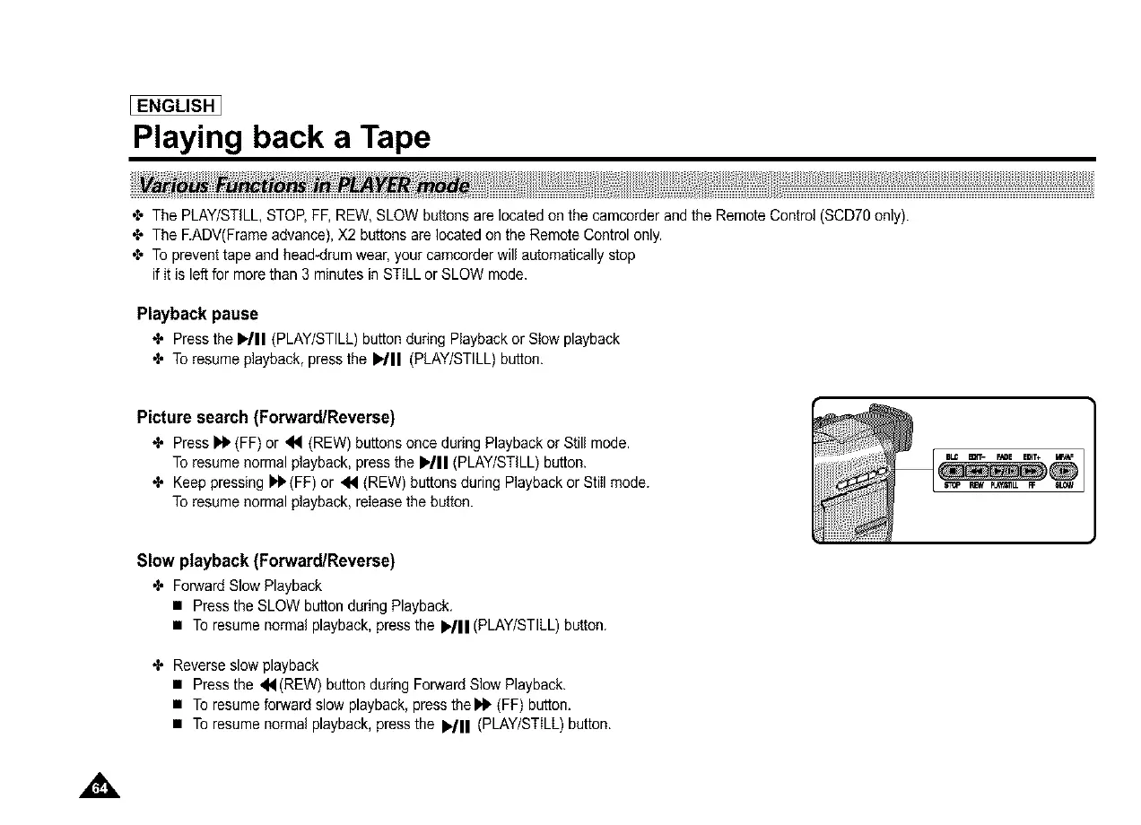 •t, The PLAY/STILL,STOP,FF, REW,SLOW buttons are located on the camcorder and the Remote Control (SCD70 only).