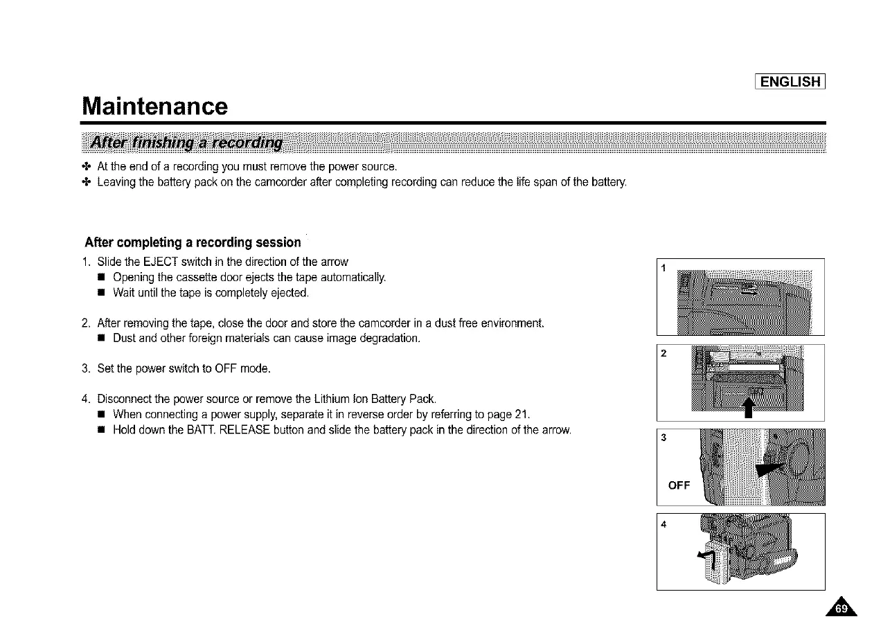 + Leaving the battery pack on the camcorder after completing recording can reduce the life span of the battery.
