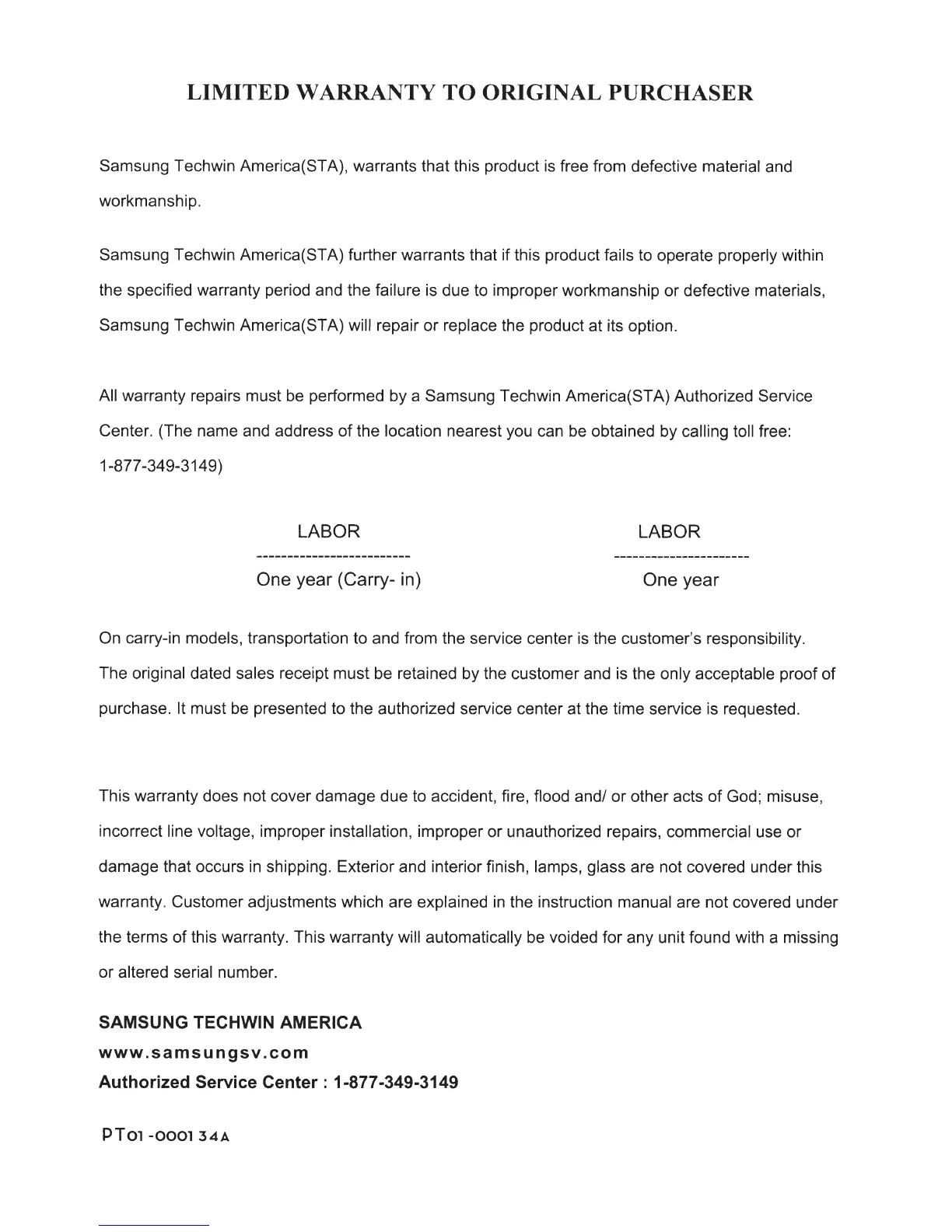 Samsung Techwin America(STA) will repair or replace the product at its option.