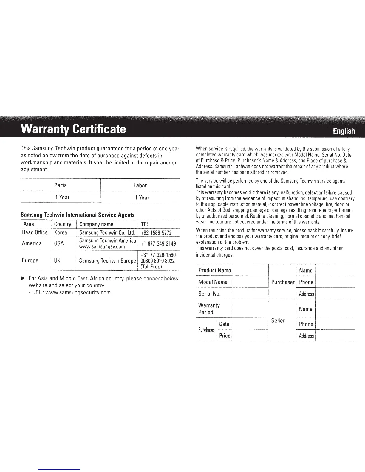Samsung SDC-9441BC - Warranty Certificate; Samsung Techwin International Service Agents